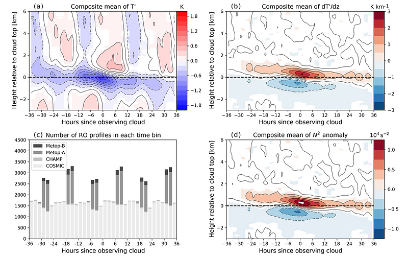 It is well known that Kelvin and gravity waves in the tropics cause temperature perturbations in the tropical tropopause layer (TTL), and that in the cold wave anomalies we can expect to find more cirrus clouds. However, Kim et al (2016) found that, in aircraft observations, cloud ice was found more frequently in a specific portion of the cold anomaly. Figure 1a shows a temperature profile from FORMOSAT-3/COSMIC, and its corresponding base state of the atmosphere. The difference between the two, shown in Figure 1b, is the wave anomaly. As you can see, the cold anomalies (blue) can be divided into two portions, the "bottom" portion, characterized by dT'/dz<0, and the "top " portion, which has dT'/dz>0. Kim et al. (2016) (https://doi.org/10.1002/2016GL069293) made an interesting finding that the "bottom" portion tends to contain vastly more cloud ice than the "top" portion. This peculiar feature interested me, and I wanted to explore whether this was a general feature of TTL clouds.